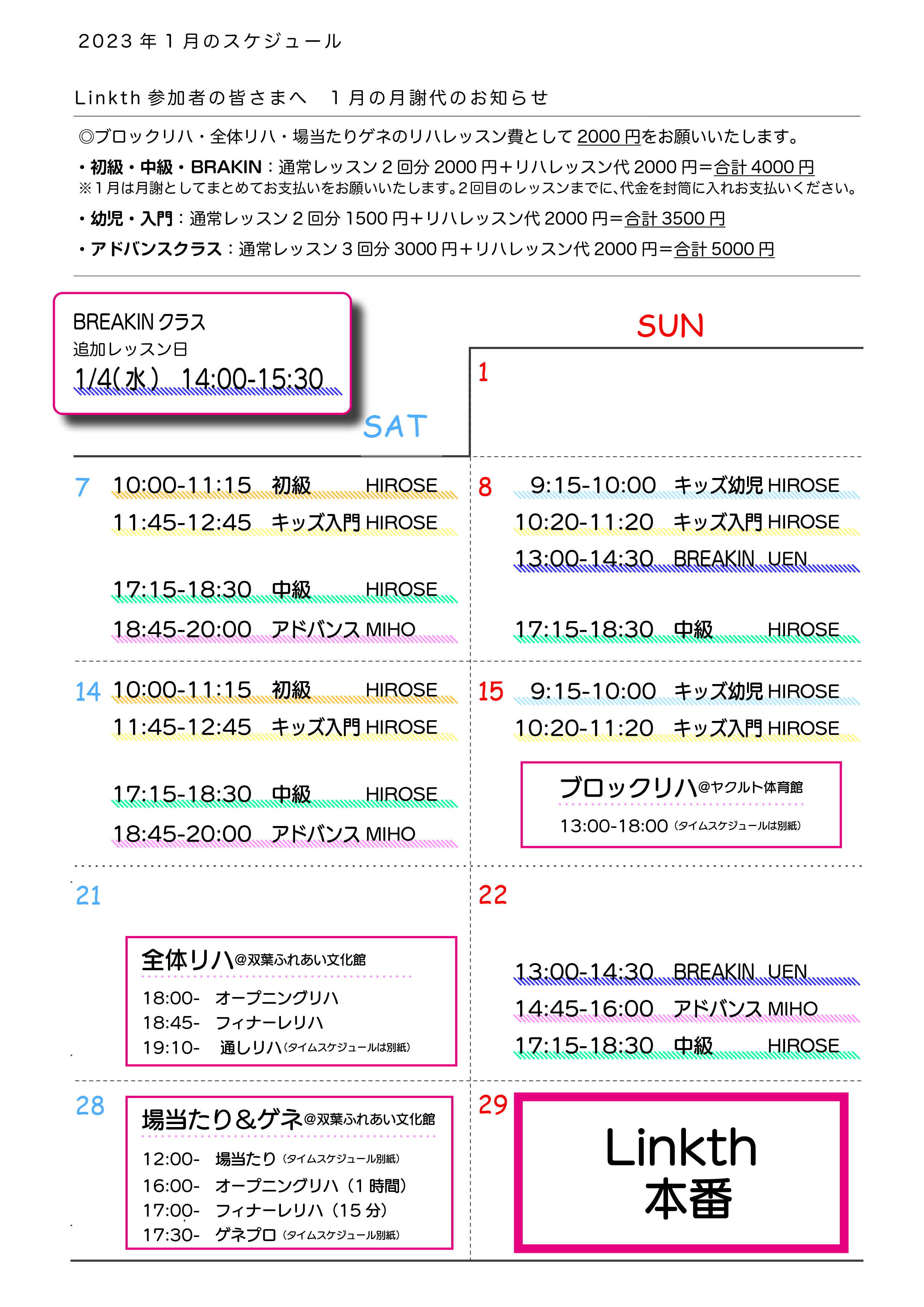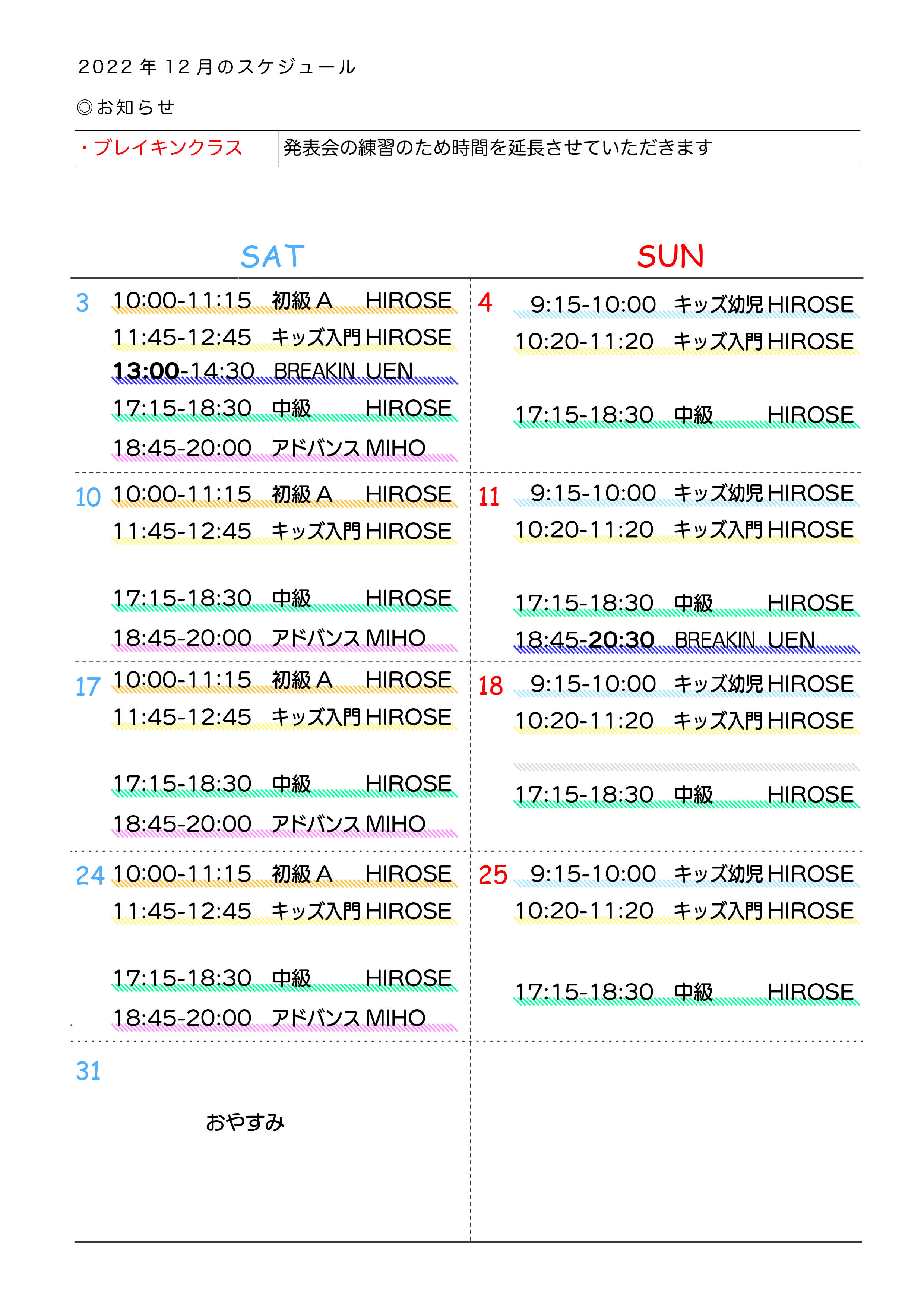 2022年12月のスケジュール(BRAKIN CLASSの時間が変更になりました)