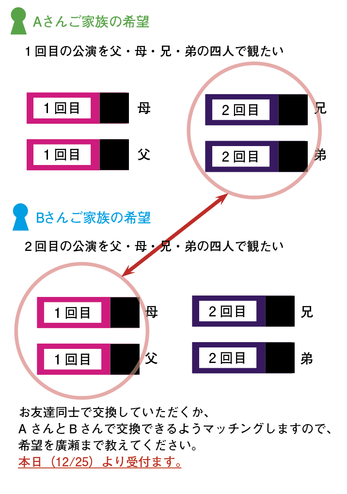 友人同士で交換するか、廣瀬までお伝えいただければマッチングします。