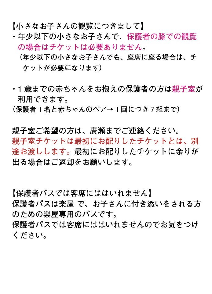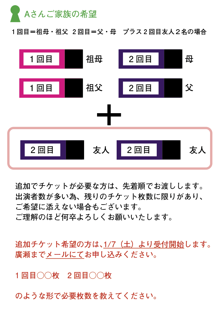 出演者1名につき1回目の公演と2回目の公演のチケットを二枚ずつお渡しします。